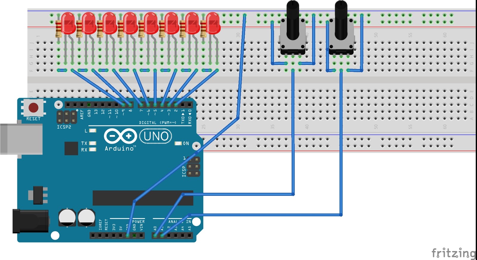 Se pretende controlar 2 barras de LEDs de 8 segmentos, cada barra posee un footprint compacto, además son 8 LEDs inviduales encapsulados cada uno con conexiones individuales de ánodo y cátodo que serán conectados al Arduino y haciendo uso de (2) IC74HC595 se debe mostrar una variación de luminosidad la cual será captada por una fotocelda, cuyaresistencia disminuye con el aumento de intensidad de luz incidente.